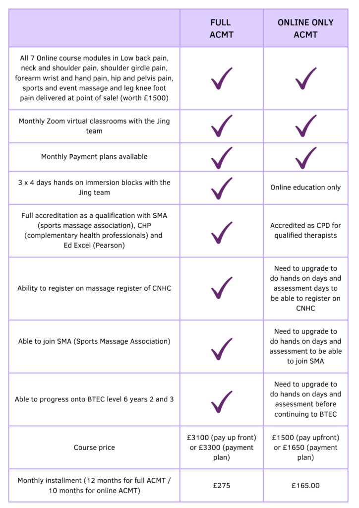 The ACMT is our professional advanced massage qualification that immerses you in the Jing method – how to get results with chronic pain in 1-6 sessions -PLUS the skills and confidence to build a successful massage practice and to get the life you desire.