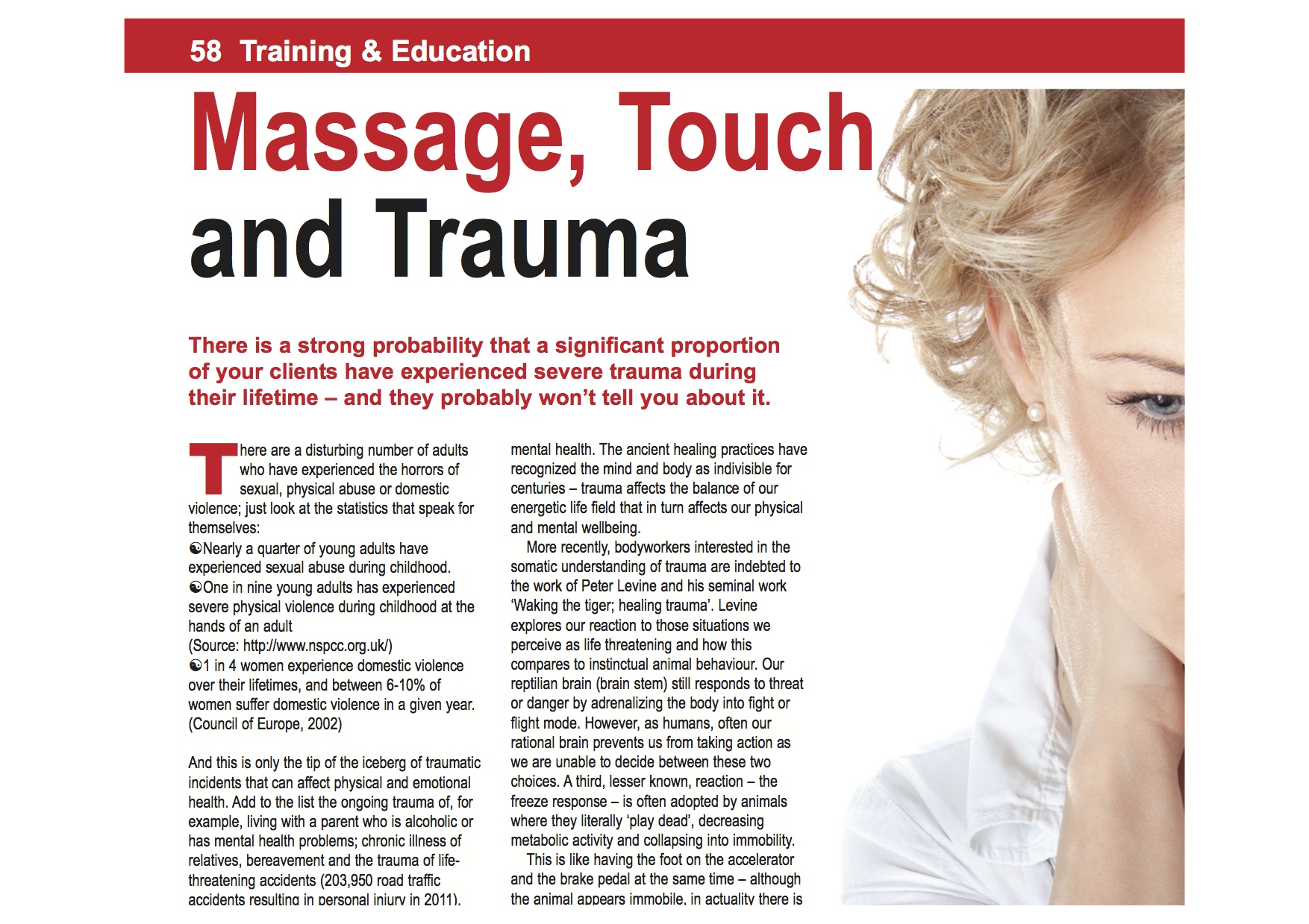 And this is only the tip of the iceberg of traumatic incidents that can affect physical and emotional health. Add to the list the ongoing trauma of, for example, living with a parent who is alcoholic or has mental health problems; chronic illness of relatives, bereavement and the trauma of life threatening accidents (203,950 road traffic accidents resulting in personal injury in 2011), and you start to have an idea of why understanding this subject is important to massage therapists.