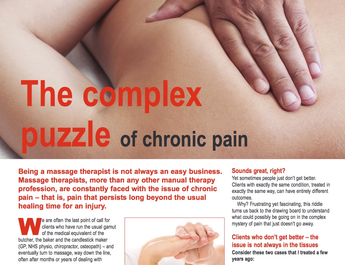 Being a massage therapist is not always an easy business. Massage therapists, more than any other manual therapy profession, are constantly faced with the issue of chronic pain- that is, pain that persists long beyond the usual healing time for an injury. We are often the last point of call for clients who have run the usual gamut of the medical equivalent of the butcher, the baker and the candlestick maker (GP, NHS physio, chiropractor, osteopath) -and eventually turn to massage, way down the line, often after months or years of dealing with constant daily pain.