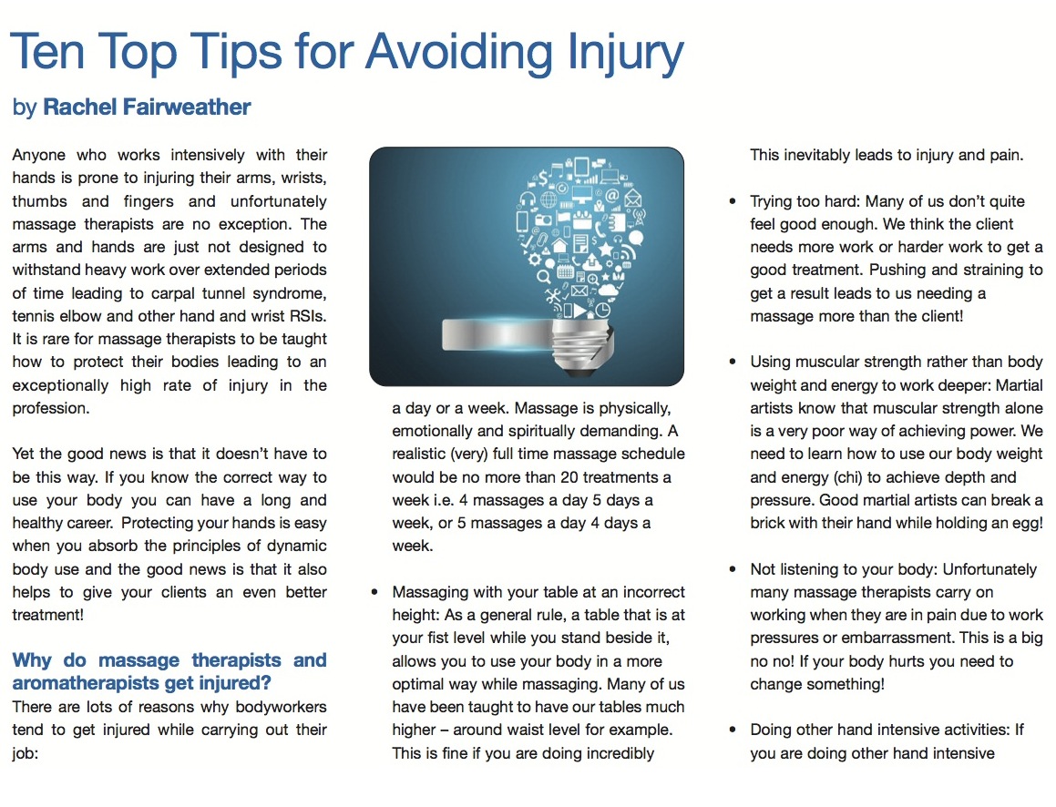 Anyone who works intensively with their hands is prone to injuring their arms, wrists, thumbs and fingers and unfortunately massage therapists are no exception. The arms and hands are just not designed to withstand heavy work over extended periods of time leading to carpal tunnel syndrome, tennis elbow and other hand and wrist RSIs. It is rare for massage therapists to be taught how to protect their bodies leading to an exceptionally high rate of injury in the profession.